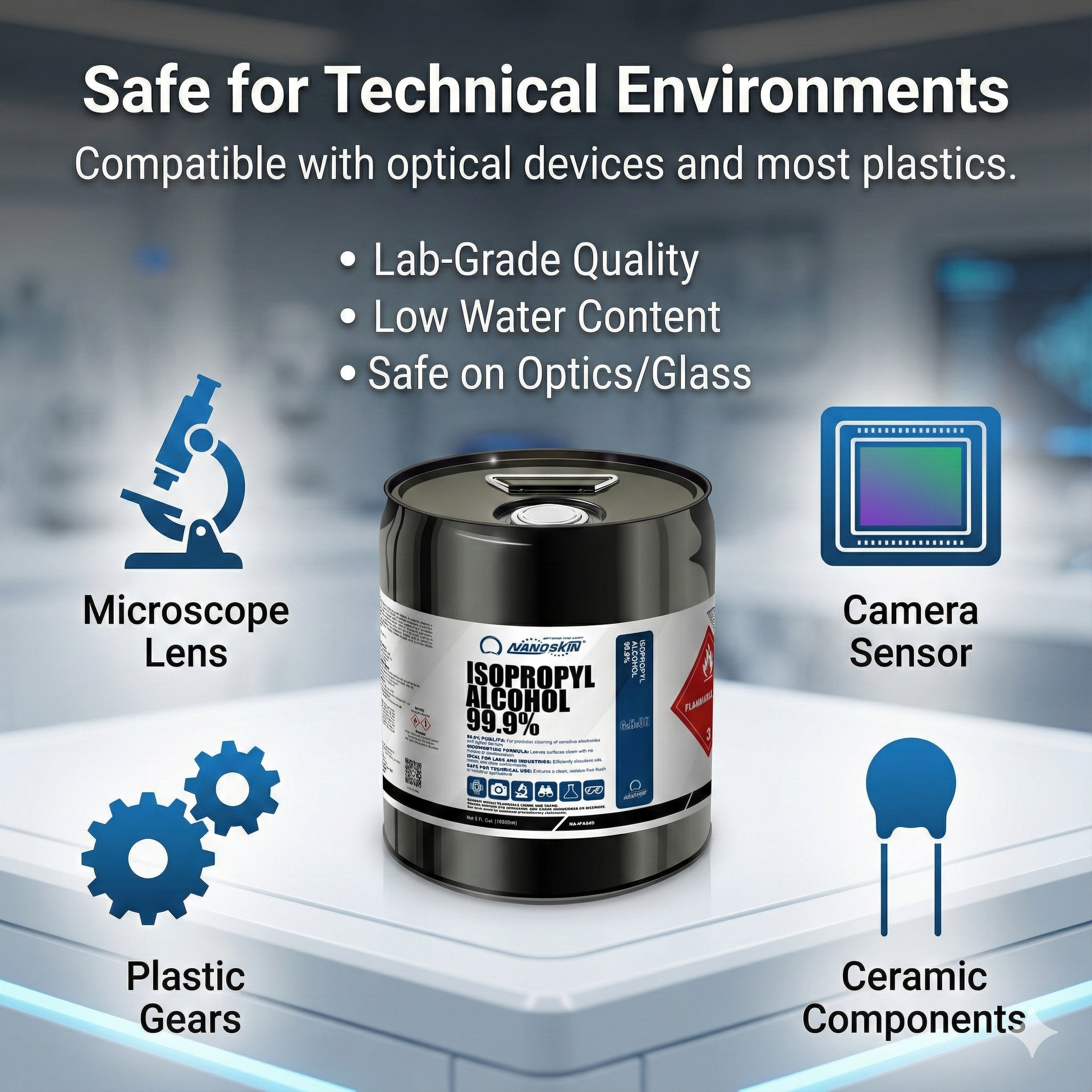 Nanoskin 99.9 % Isopropyl Alcohol is a technical-grade solvent refined to laboratory standards; every batch is tested to confirm less than 0.1 % water, so professionals can count on a rapid, even evaporation and a surface that dries absolutely residue-free. This level of purity is critical when a trace of moisture or contaminant can distort a laser beam, undermine instrument calibration, or weaken an adhesive bond.