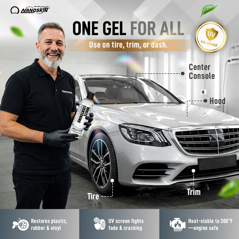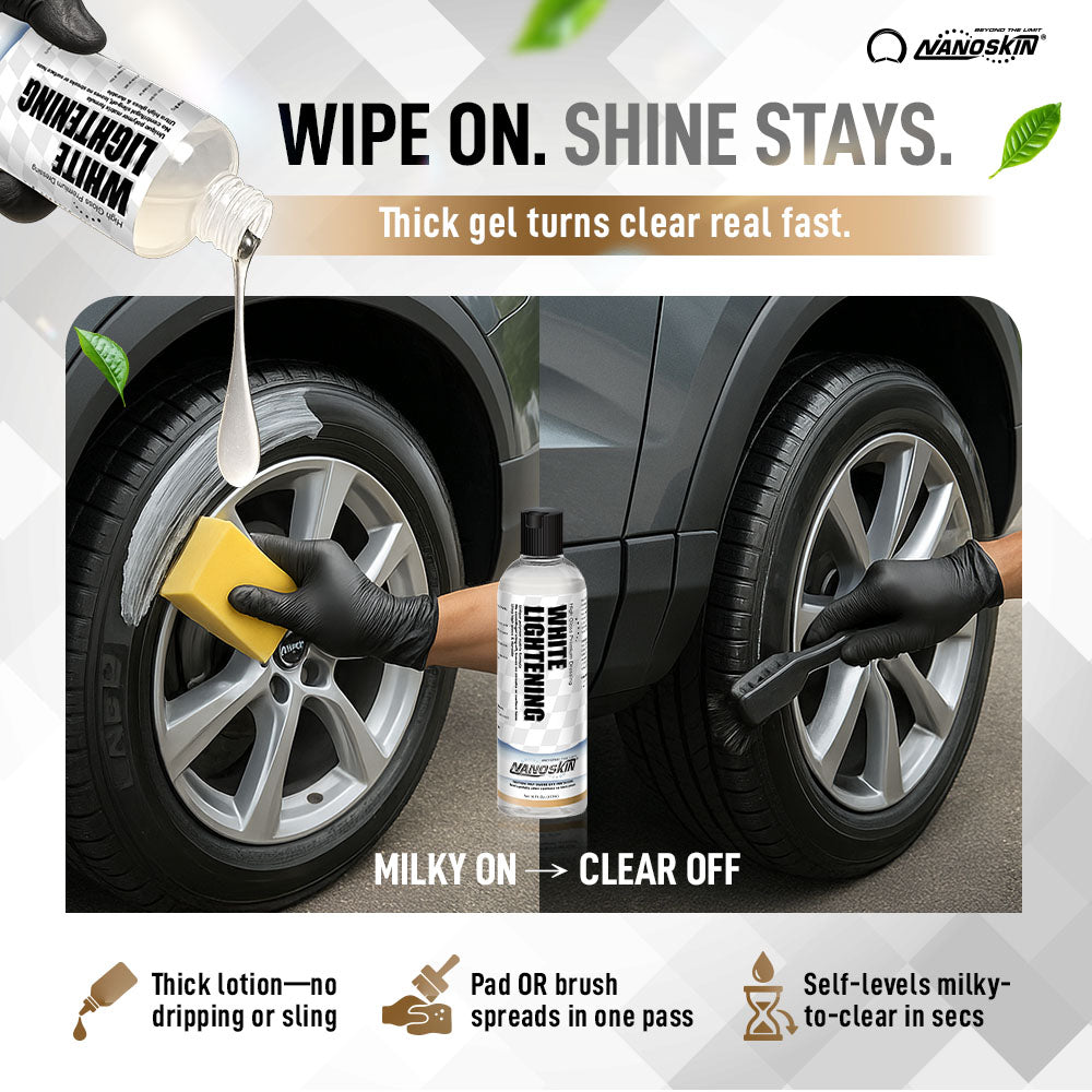 ✅ UNIVERSAL DRESSING: Special formulation that is not too thick and not too runny. Nanoskin White Lightening applies easily to sponges and brushes without mess, and goes onto surfaces without drips and runs. White Lightening spreads easily and imparts an even color rejuvenation, plastic, textured plastic, and rubber surfaces.